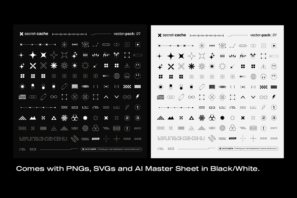 Over 100 vectors/icons are inside this pack, including SVGS and PNGs in both black and white, as well as a master sheet illustrator file.